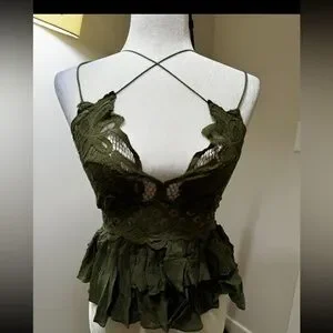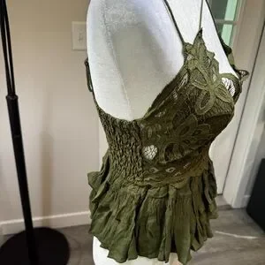 NWT Free People Olive Sparrow Green Adela Lace Frilled Cami / crochet lace top
