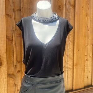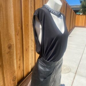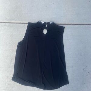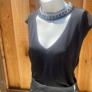 It is a fun, sexy, chic, sleeveless going-out top with the most beautiful rhinestone detail on the collar and cutout in the front. ♠️