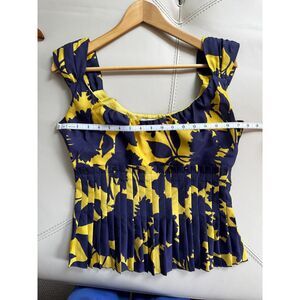 Y2K Pleated peplum top from Moschino in yellow with blue floral print. Snap buttons to close along the side of the blouse as photographed.