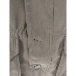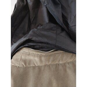 Military style, green suede, very soft outer material, inner lined, front zipper closure with buttons,