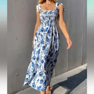 Women's Floral Print Tie Strap Square Neck Ruffle Boho Maxi Dress