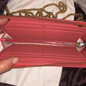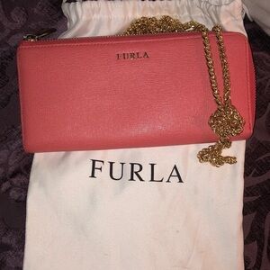 Stunning Furla pink wallet on chain conversion in outstanding condition. Edges, corners, interior all excellent. Shiny gold hardware with minor scratches. Comes with dust bag. Please review all pics before bidding as they are part of description. Bid responsibly as all bids are binding.