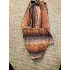 Type: One piece swimsuit; It crosses in the back, and is a halter design, and low cut.