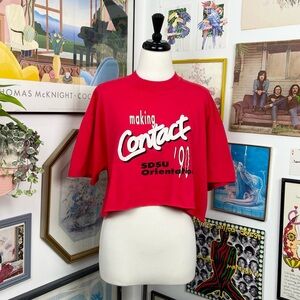 1990 San Diego State University Orientation cropped t-shirt. Lightly worn, cracking on graphic