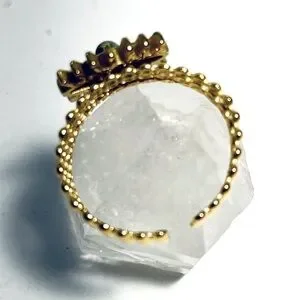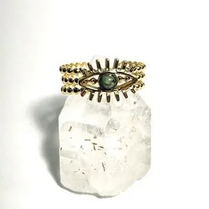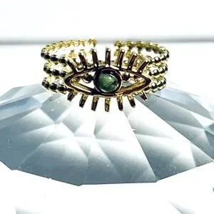 Stunning new beaded green stone evil eye ring. It’s on trend and adjustable about a size up or down from a size 7. 18k gold plated stainless steel with natural green stone.