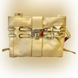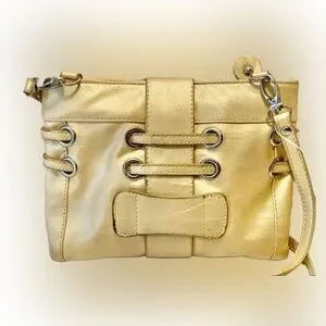 This gorgeous Jimmy Choo crossbody bag is in good condition but the straps have some slight fraying. Crafted from authentic genuine leather, it features gorgeous silver-tone metal accents, leather straps that lace through metal eyelets, complete with a brand engraved flip lock. This Jimmy Choo beauty is a champagne yellow/gold metallic leather baguette that can be worn at shoulder or with optional crossbody strap. (Comes with 2 straps).. Inner lining is immaculate beige microfiber fabric with zip and slip pockets. I believe it’s called the Riki bag!