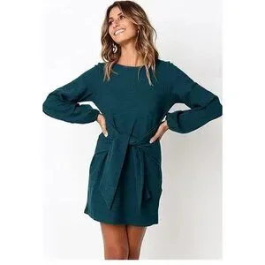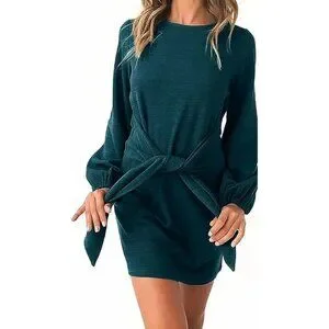 PRETTYGARDEN Womens L Elegant Long Lantern Sleeve Short Dress Crewneck Tie Waist