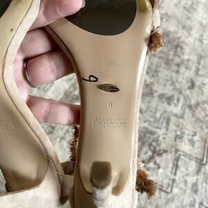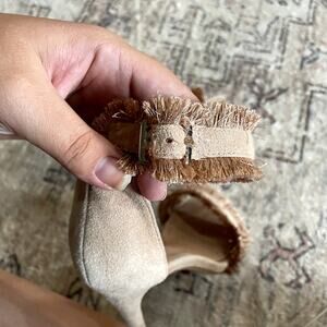 Suede upper with man made sole. Ankle strap with buckle closure. Fringe detail. Heel measures approx 4" H. Revolve Style No. TONR-WZ97. Gently used, good condition. Sold out online on Revolve.