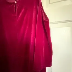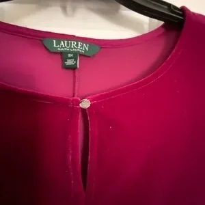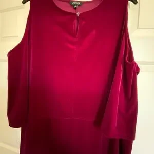Lauren woman cold shoulder to with round neckline with loop on the front with a silver small button with deep cold shoulders on it and with splits on each side at the bottom and with dropped waistline around the middle of the top 90% polyester and 10% elastane