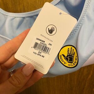 For sale is a brand new with tags two piece bikini by Body Glove! Sanitary sticker still in place, both pieces are size Small. Top zips up in front, adorable blue and white. MAKE OFFERS! This listing is for BOTH pieces!