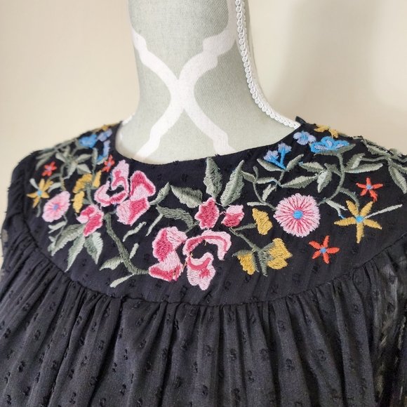ZARA Trafaluc Black Embroidered Floral Long Sleeve Tassel Chiffon Top Boho XS