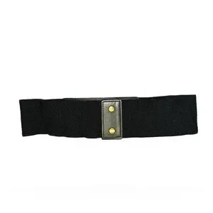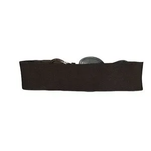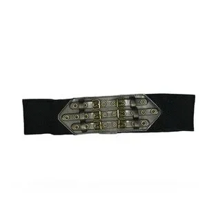 Size Small or medium Black Belt. The front is for decoration only, the buckles do not have any other purpose. The elastic band comes together and snaps in the back with 2 fasteners. Very stretchy band. It measures approximately 14” across when it is snapped together, and it is about 30.5” in total length - unstretched. It is just under 3” wide