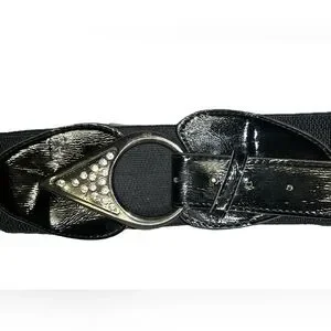 Size Small or medium black and silver with rhinestones elastic banded belt with shiny faux Patent Leather or PVC buckle