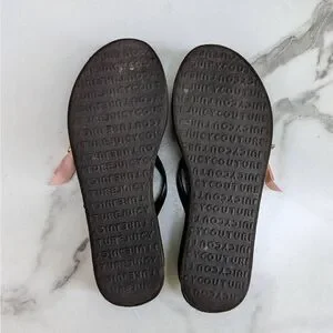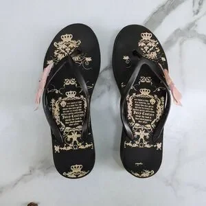 With a chic black and greige(grey-beige) color scheme, these sandals feature a playful bow accent with charms on the strap, adding a touch of girlish charm to your look. The outer side of each sandal reads "Smells like couture" in the same greige. The platform wedge at its highest measures at 1.5" tall. The lightweight rubber material makes them comfortable to wear all day long, while the vintage design adds a timeless appeal.