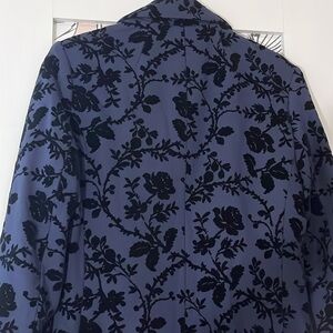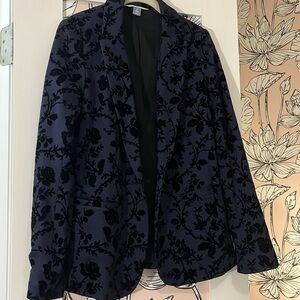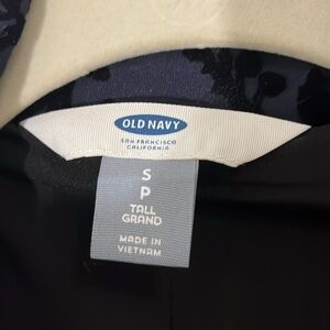 This is an amazing blazer - Old Navy Blazer, navy with black floral velvety appliqué pattern. Size S, maybe a Tall. I don’t remember it being tall but it says that in the tag.