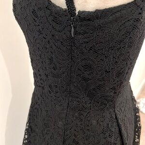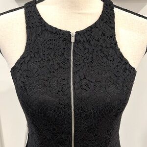 Sweet skater dress with lace overlay. Front silver zipper detail with side zipper closure. Two front pockets. Dress is fully lined.