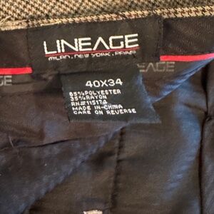 LINEAGE Dress Slacks 40x34. Well made, pleated front, cuffed, machine washable and preloved. GUC-no stains or tears. Regular fit. Fabric content: 65% polyester, 35% rayon.