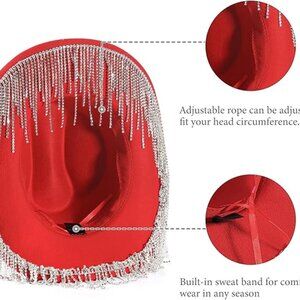 The rhinestone fringe on the brim is a moderate length, and will not obscure the eye view