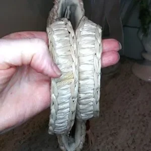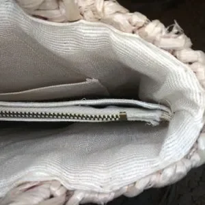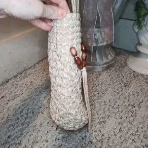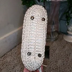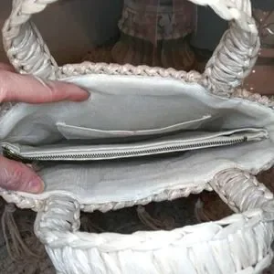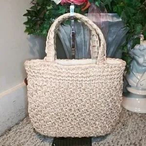 EUC Cute vintage 70's, boho, hippie style crocheted light tan straw small tote style purse, with dark brown wood beads and crocheted straw cord tassels, made in Taiwan. Purse has cream fabric lining with center zippered pocket, back patch pocket with attached Taiwan label. Inside lining is very clean, but the center zippered pocket's stitching is coming loose from the zipper a little on the right side. Body of purse is in excellent shape, purse bottom has metal feet to help keep it clean. Back side of handle on left side is missing a stitch, appears to be a factory flaw, as it's sewn in place. The little bit of pink that's showing on the inside of the handles in the photos is whatever they used to make the handle shape and it's peaking through the straw. Only spots that I saw on straw were on the handle, not that noticeable. This is a very sturdy purse, you might be able to add a clip on strap to turn it into a crossbody. Please see all photos.