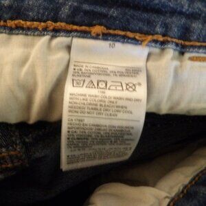 medium wash , super skinny leg , 4 pocket style with belt loops, lightweight material is 74% Cotton 15% Polyester 10% Rayon 1% Spandex , Sz 10 rise measures 10" Inseam Measures 27" Waist lying flat measures 16" , Decent wearable pre owned condition no holes stains or distressing , showing minor wear in crotch and crotch is intact with no holes, pet friendly non smoking home
