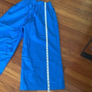 Like new. Approximate measures added. The top has beautiful flowers details and it has elastic in the back. The pants have elastic in the back too and zipper in the back. It is a cute piece for the summer. There is nothing wrong with the set but I am ready for something new.
