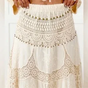 ONE LEFT POL Cream Crochet Knit Metallic Beaded Elastic Waist Maxi Skirt