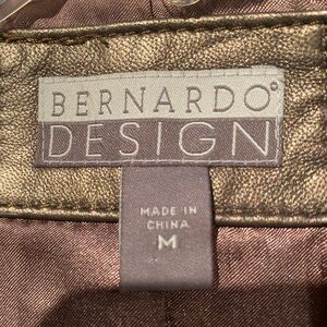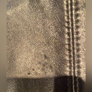 100% leather. Gold in color. Gently used. One surface stain shown in pic. May be removable. Front zip with two pockets.