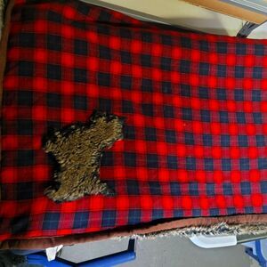 Cozy Furry Dog Printed Red and Blue Patterned Comfortable Soft blanket, it is in pretty good condition and see images for further details.