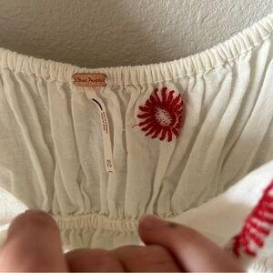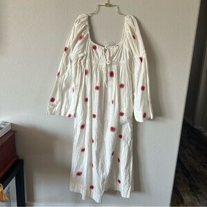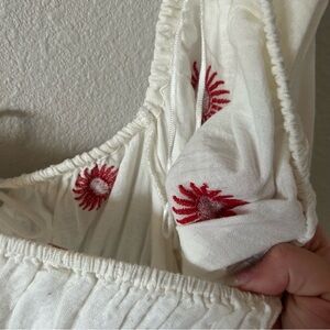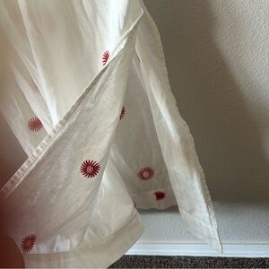 Cotton and linen blend fabric in an ivory color with red embroidered suns all over. Open back detailing.