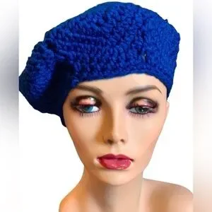 UNISEX KNIT BERET SLOUCH HAT HANDMADE CROCHET BLUE WARM WINTER GEAR OS