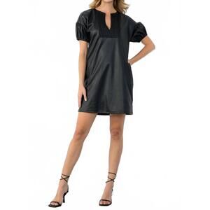 Step into sophisticated elegance with the Short Sleeve Leather Dress by THML, a must-have for any festive occasion. This solid black, quiet luxury piece features short puff sleeves and a classic crewneck in a chic shift silhouette, enhanced by a flattering center seam. Made from high-quality leather, it ensures style and durability, while handy pockets offer practicality. Closure: Pull-on style. Care: Dry clean only, demonstrating a perfect blend of fashion and function for spring.