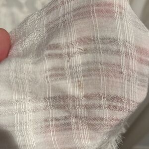 Worn once. One tiny mark close to the bottom, which I have not tried to wash off. naturally frayed hem. The chest measures 24 inches across.