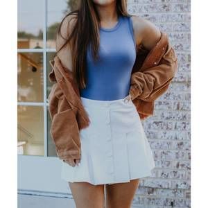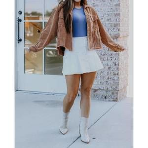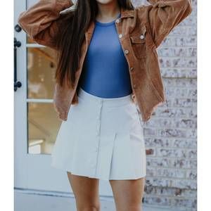 We are loving this gorgeous faux leather skirt. It is pleated and has the cutest button detail. Pair this with your team colors for the cutest gameday outfit! Kaylan is wearing the Small, and she is a Size 3.