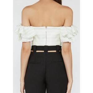 The Acler Tacuba Bustier is the perfect spring piece. This off the shoulder design features a fitted bodice punctuated by delicate frill detailing for a modern feminine style. Bustier neckline. Off-the-shoulder. Ruffles on sleeves and neckline
