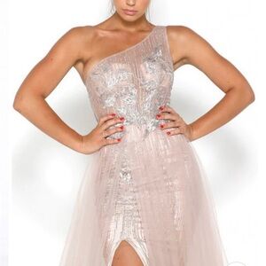 Portia & Scarlett PS2016 maya Gown is a one shoulder bodice encrusted with lace throughout the bodice. The gown also has a glitter underskirt with side split and a soft tulle over skirt with lace bleeding onto the waist line. Size is 4P, but fits like a 2P.
