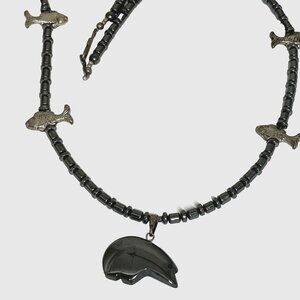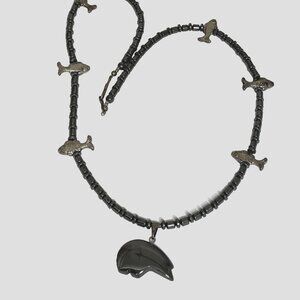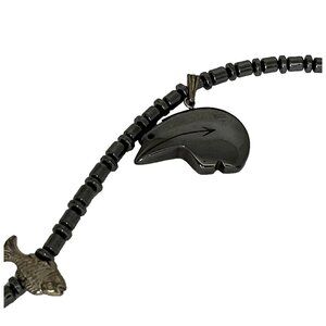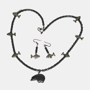 Southwest Hematite Native Fetish Bear w Fishes Set Necklace, Drop Earrings 21" L