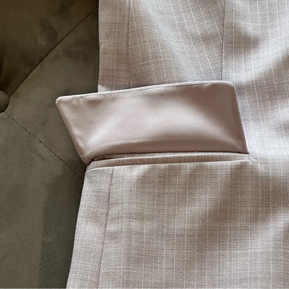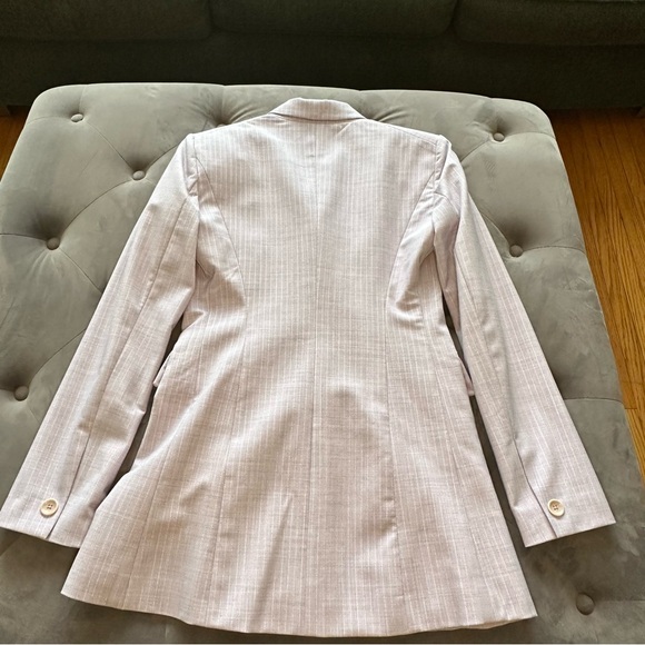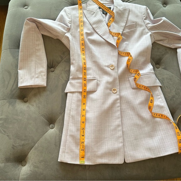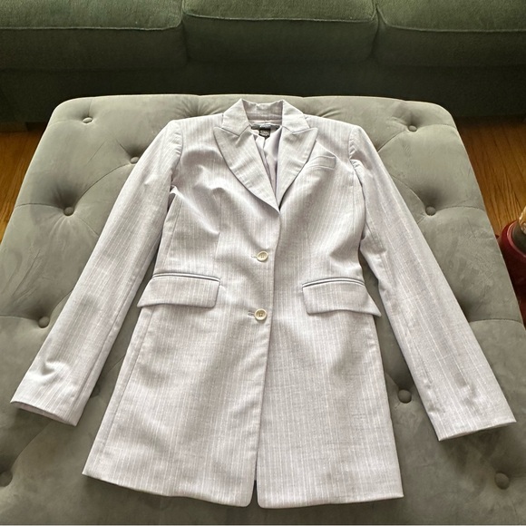 Lavender Two Button Single Breasted Blazer with Metallic Silver Pinstripe. Body by Victoria Size 4. Fully lined Like new the pockets haven't been opened yet. Shell - 63% Polyester, 32% Rayon, 4% Spandex, 1% Other Fiber. Lining - 100% Polyester Approximate measurements in photos.