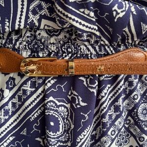 This is a super cute, fully lined sleeveless dress from Alyx, women’s size 18. The fabric, 100% polyester, is a bandana-inspired pattern in navy blue and white. The lining, also 100% polyester, is navy blue. Features a V-neckline with ruffle detail, blousy bodice, elastic waistband, and included belt. The belt shows some wear (see picture), but you could choose to wear it without, or add your own - it works well either way! Pairs well with flats, or go with cowboy boots for a whole different vibe!