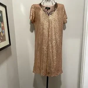 Lulu’s peachy-pink sequin mini dress. Short sleeves. V-neck.