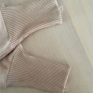 Wide ribbed band on the lower legs that can be cuffed. There are a few thread pulls on the hems- see last photo.