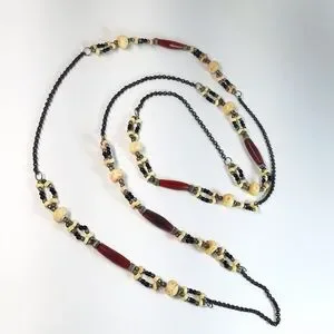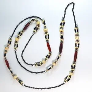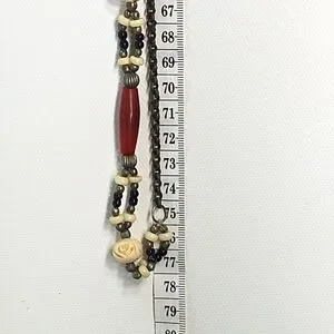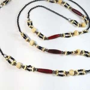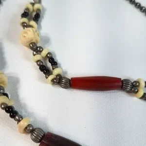 Hand carved bone rosettes with bone, black and silver beads on black chain.