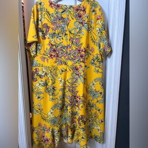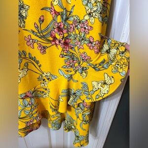Apt. 9 yellow floral dress. Ruffle detail at hem. Hidden zipper with hook & eye closure. 96% polyester/4% spandex. Worn once. Smoke free pet friendly home.
