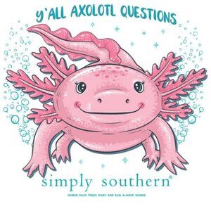 A playful twist on Southern charm with the Simply Southern Axolotl Questions T-Shirt. This quirky tee features a beloved axolotl (a relative of the salamander) graphic and a fun phrase, perfect for lighthearted get-togethers. Show off your unique style with this must-have addition to your wardrobe. Y'all will love it!