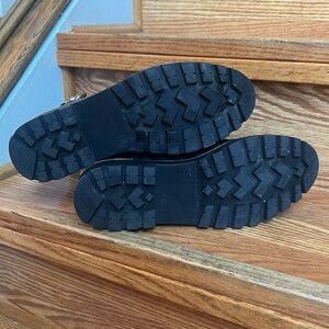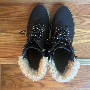Step out in style with these chic women's ankle boots. Featuring a sleek black design with cozy cream accents, these boots are perfect for any occasion. The durable construction ensures comfort and longevity. In overall great condition, only worn a couple times. Has two small marks on front as shown. Has a zipper to easily put on and off.