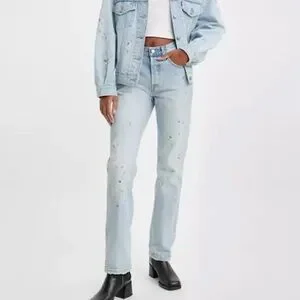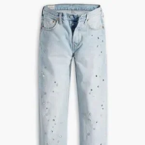 NWT Levi’s 501s in “bling blau.” Currently still on the website. Classic 501 style with silver, blue, and white studs and rhinestones. Bought two pairs final sale and only keeping one. 31x30, no stretch.
