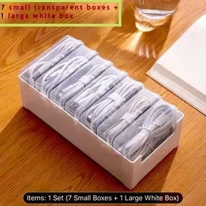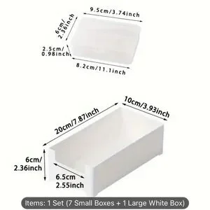 NWOT, 1 set will come with 7 small clear boxes and 1 large box to hold store your small boxes. Great way to organize office drawers or your office table.