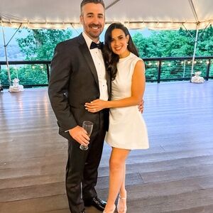 I ordered this from Odd Muse and wore it for the second part of my wedding. It is a size S and has been dry cleaned. The material is satin. I got many compliments on this outfit.