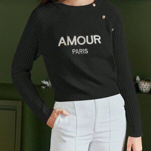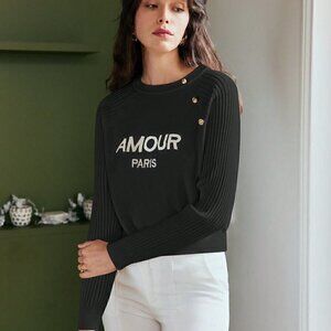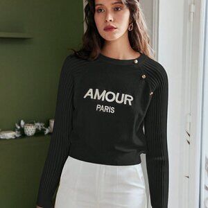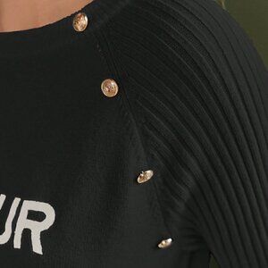 Black Preppy Womens Letter Graphic Button Detail Raglan Sleeve Sweater