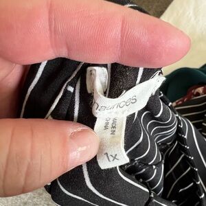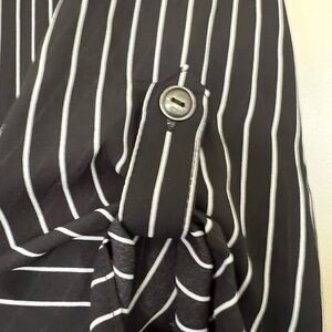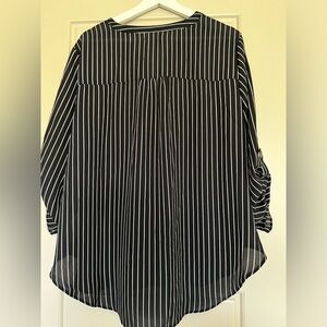 Maurice’s Atwood 3/4 sleeve popover blouse. In black with white stripe. Feminine fit, drapey fabric, and just the right length for tucking in or leaving out. It's the perfect fit and look for work date nights.