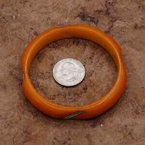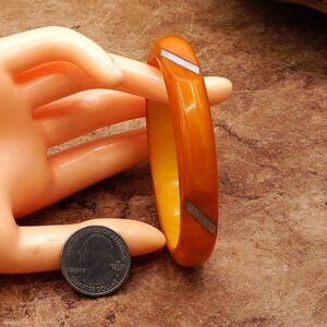 1930-50 Vintage Bakelite Butterscotch Orange Carved Bangle W/ Metal Inlay 8 Inch